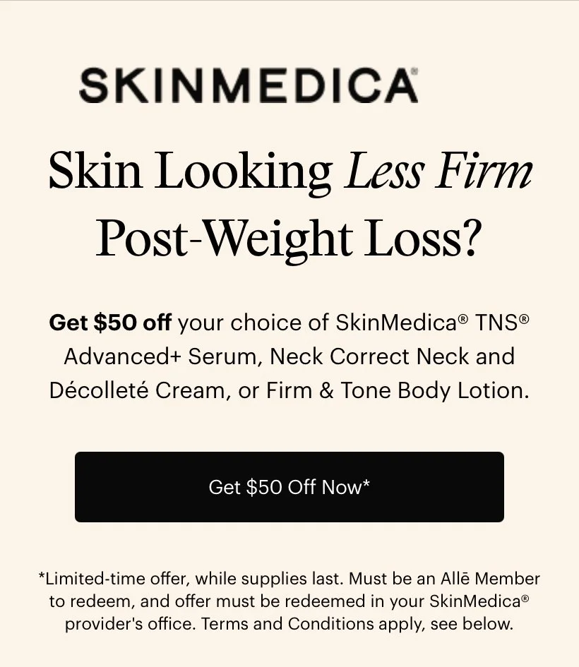 Current SpecialsScroll for all the offers! SKINMEDICALearn how save 30% off of SkinMedica everyday with SUBSCRIBE AND SAVE! You always get free shipping and Alle rewards on every purchase and can cancel at anytime just by logging into your Alle account! Learn how to get 30% OFF Skinmedica SHOP NOW